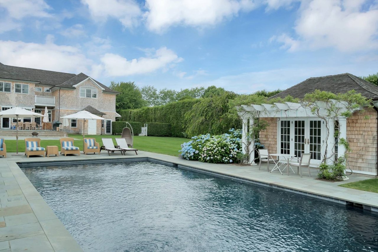 Beautifully appointed Transitional style home in a wonderful south-of-the highway location. Recently renovated to perfection, features include an open great room with vaulted ceilings, stunning eat-in kitchen and dining area, 6 bedrooms, 6 full baths plus two powder rooms, three fireplaces, finished lower level with den, gym, bedroom and bathroom, and an attached three car garage. The professionally landscaped property surrounds the heated gunite pool, pool house and cabana. The perfect summer retreat in a fabulous location!